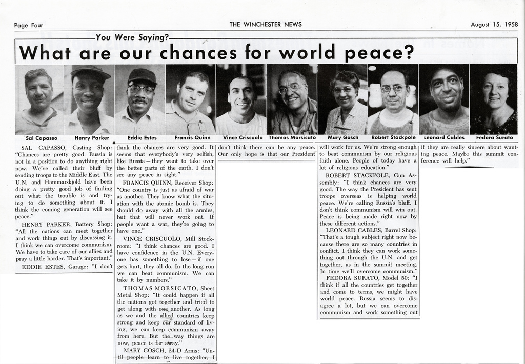 Of the 10 workers queried on this question by the Winchester News, August 15, 1958, most seemed to feel that “”beating communism” and “defeating Russia” were synonymous with achieving ‘world peace.’
