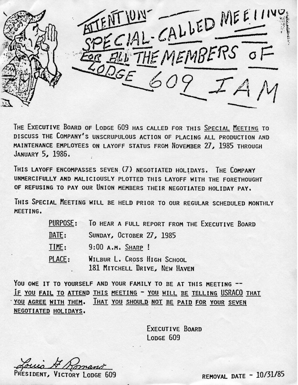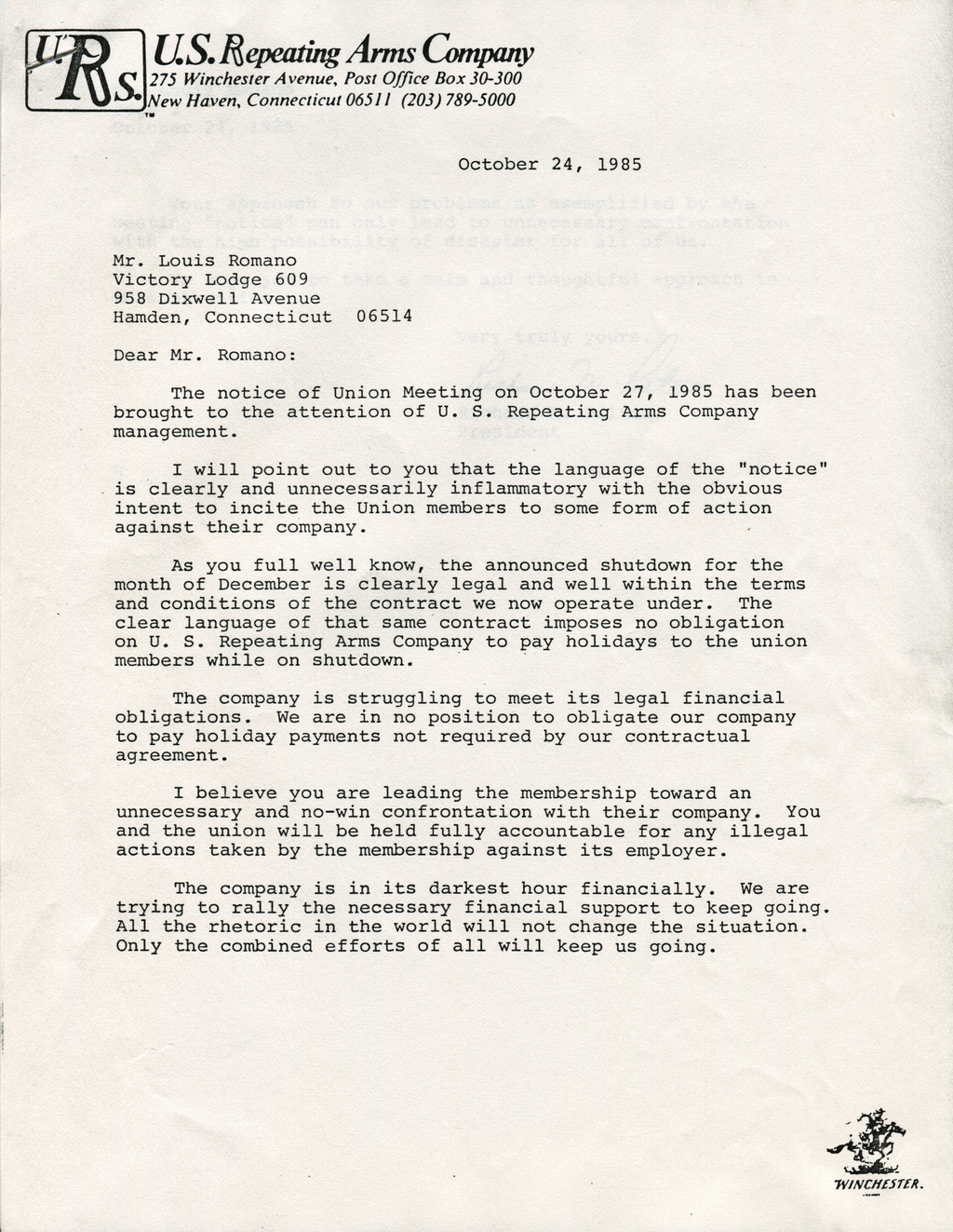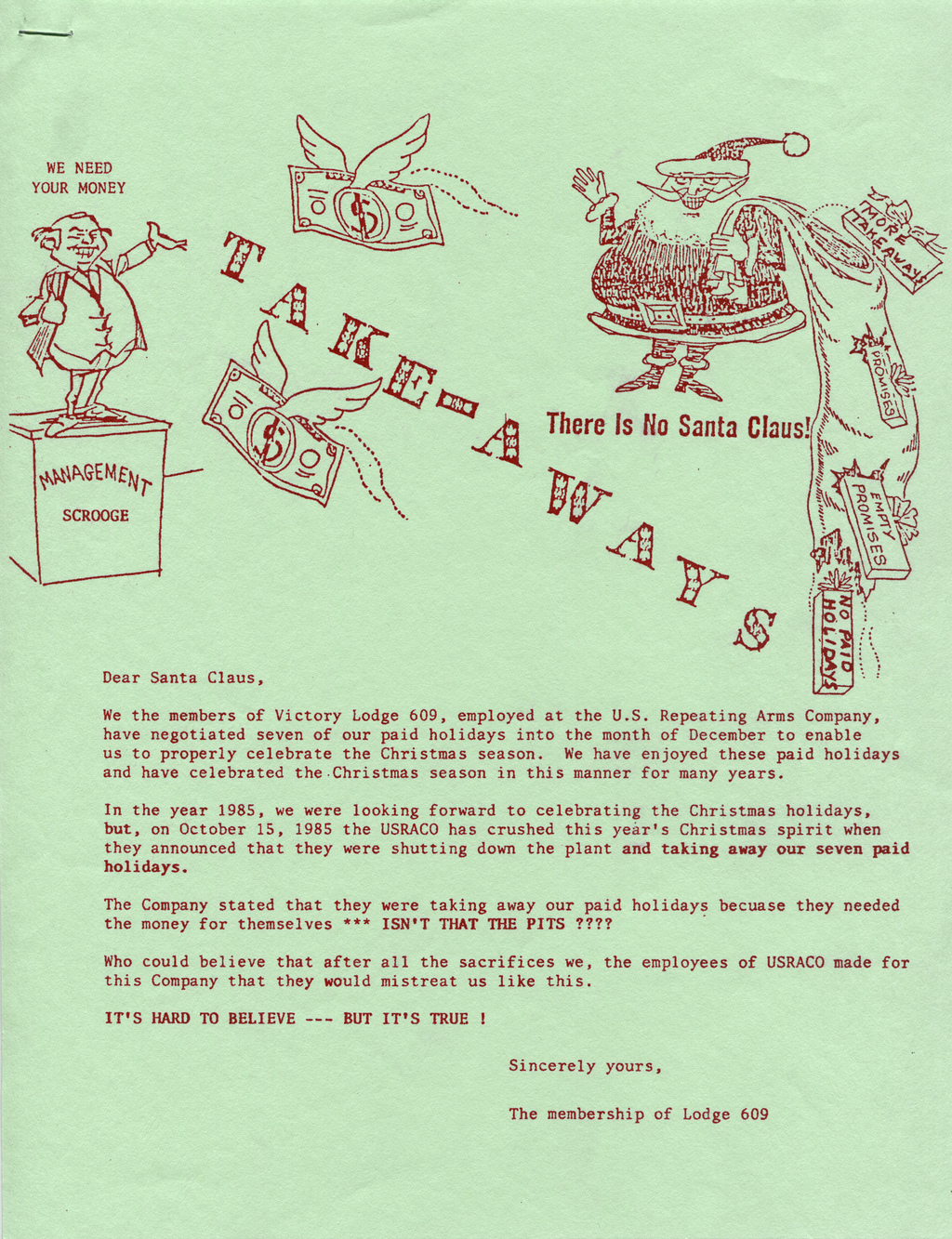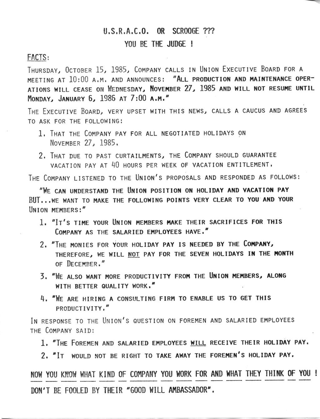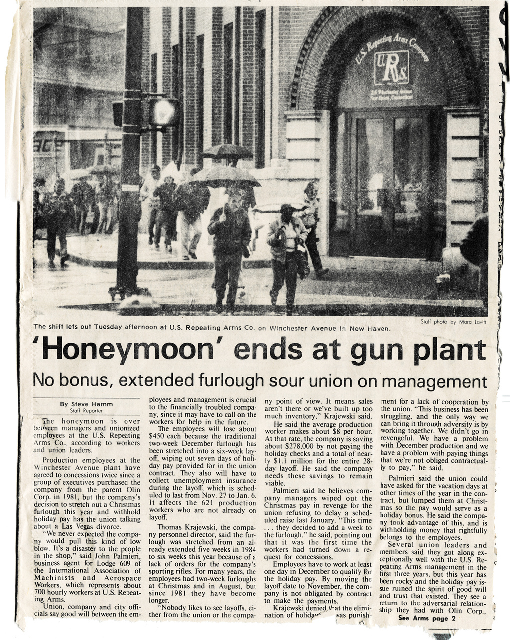 “Production employees at the Winchester Avenue plant have agreed to concessions twice since a group of executives purchased the parent company in 1981, but the company’s decision to stretch out a Christmas furlough and withhold holiday pay has the union talking about a Las Vegas divorce.”