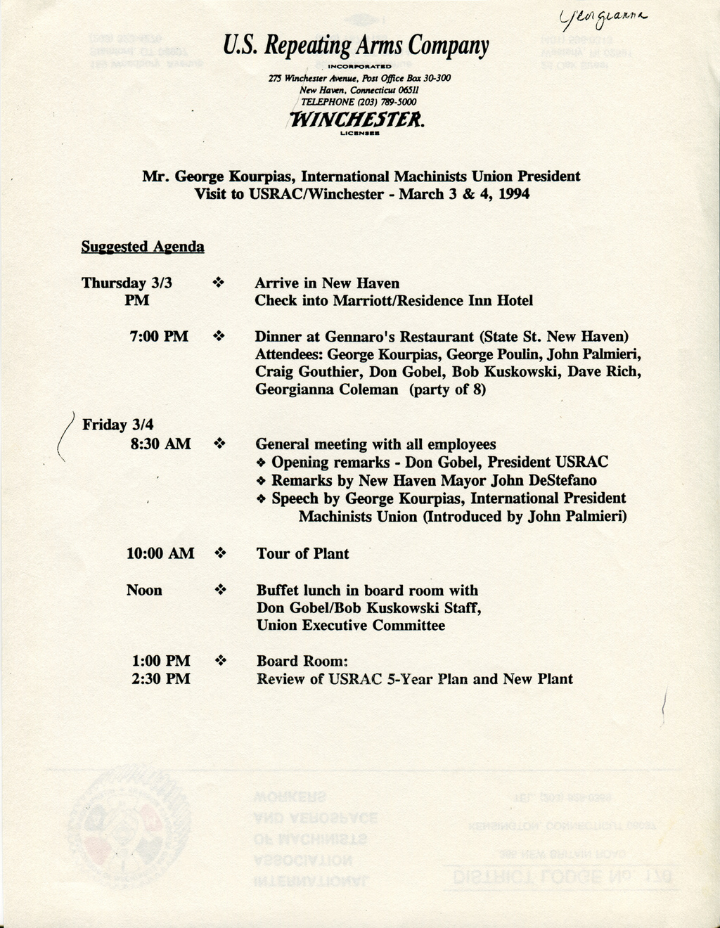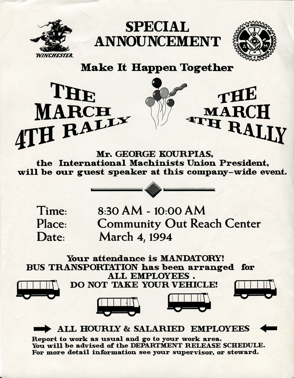 At the beginning of March, 1995, International Association of Machinists Union President George Kourpias visited the Winchester plant for a two day kick-off event which included a general meeting of all USRAC employees; conferences among union leaders, USRAC management and New Haven’s Mayor, John DeStefano; and a mandatory rally.